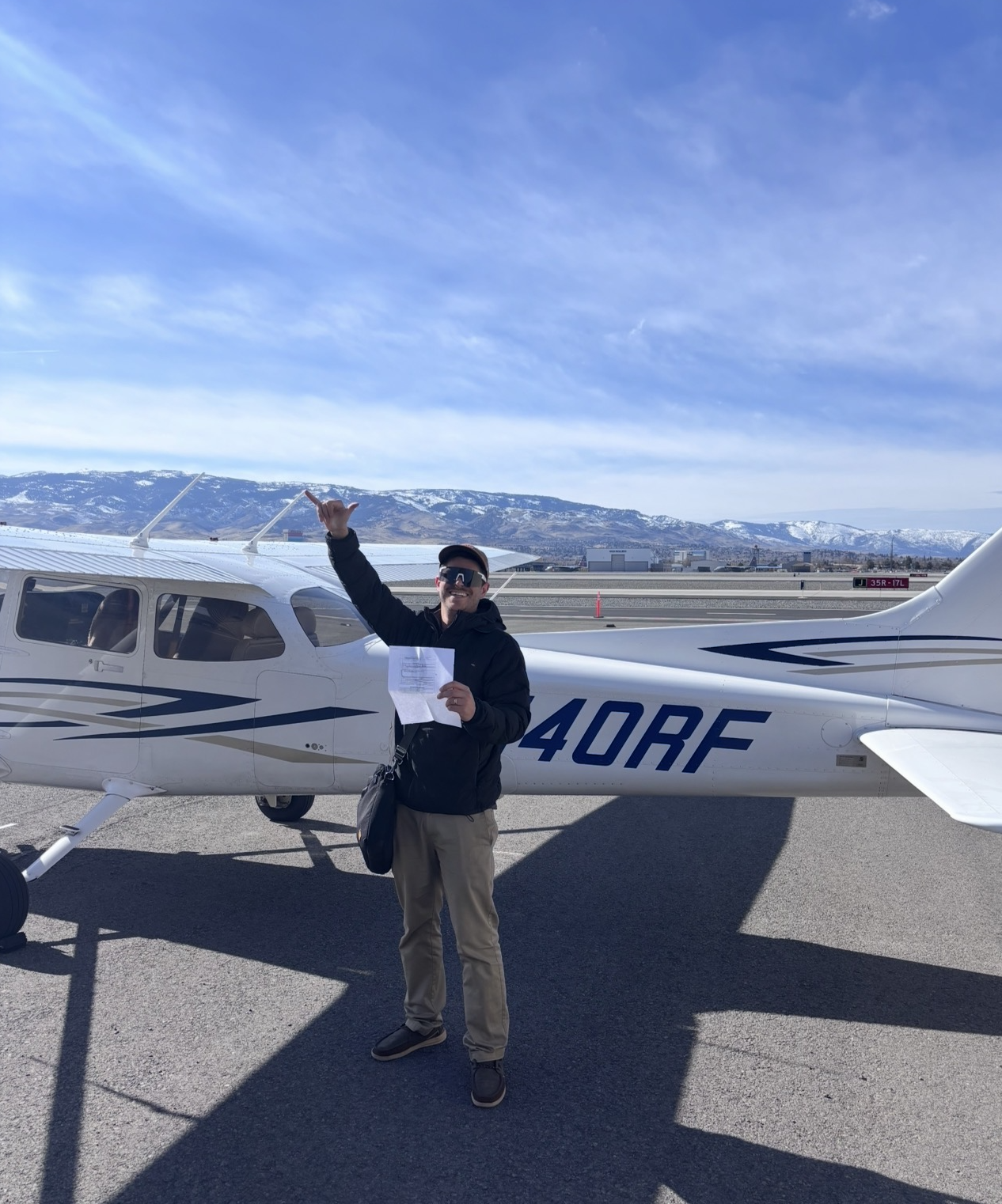 Big congratulations to Cody Sbranti on earning his Private Pilot Certificate today! Cody’s journey to his PPL has been nothing short of impressive—balancing his studies while finishing up his degree, battling Northern Nevada’s unpredictable weather, navigating the craziness of checkride scheduling, and still staying focused and prepped for this big day. Cody is truly amazing! As an Air Force Veteran and an avid outdoorsman, Cody has shown determination and grit every step of the way. And let’s be honest, we didn’t need to “motivate” him at all when it came to ground school—he had his goal in mind and made it happen. We’re so proud of you, Cody! A huge shoutout to his CFI, Alex Spencer, for guiding him through this incredible achievement. Awesome job, Cody!